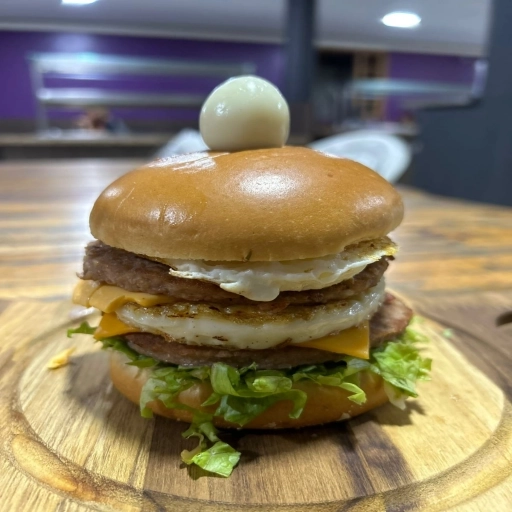 Pão Brioche, Carne de Hambúrguer, Bacon, Ovo, Queijo Cheddar Fatiado, Molho Cheddar, Molho Grill, Tomate e Alface.