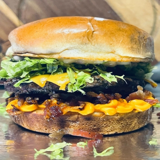 Pão Brioche, Blend Carne Bovina 200g na brasa, Bacon , Queijo Cheddar Fatiado, Molho Cheddar, Molho Tasty, Vinagrete, T... Ver completo